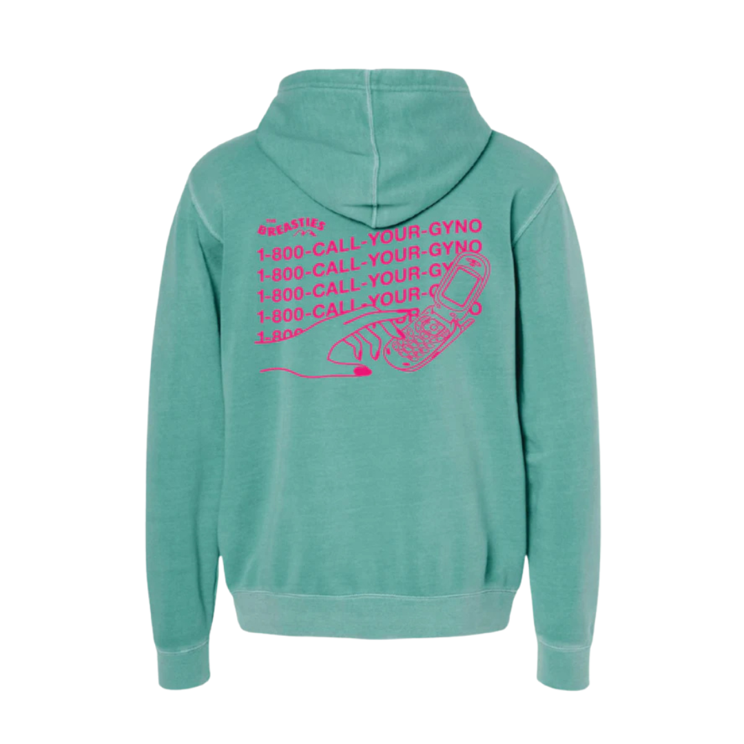 This TEAL, “1-800-call your gyno” hoodie is soft, cozy, with a bold design —reminding those around you to schedule their annual visit with an OBGYN and to talk about the signs and symptoms of gynecologic cancer.